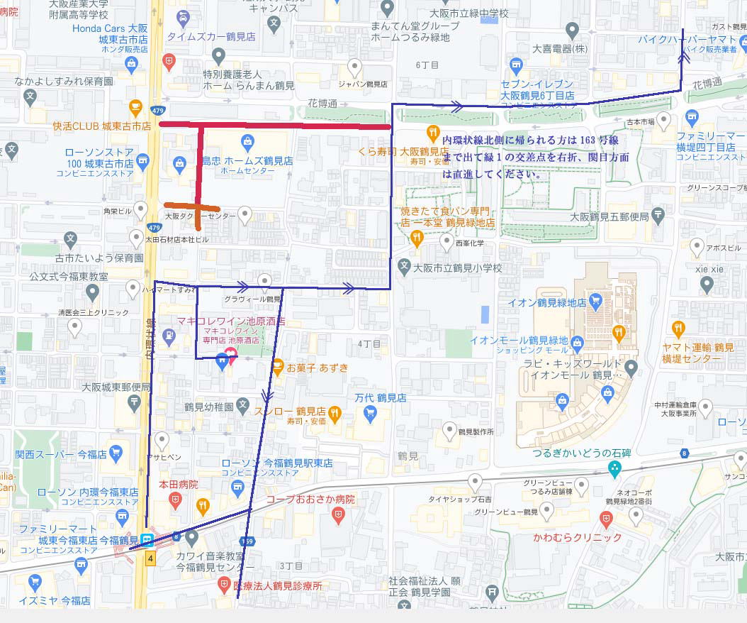 付属高校前からう右折して内環状線に入り、鶴見4交差点を左折して、シマホさんを通り越して、先の