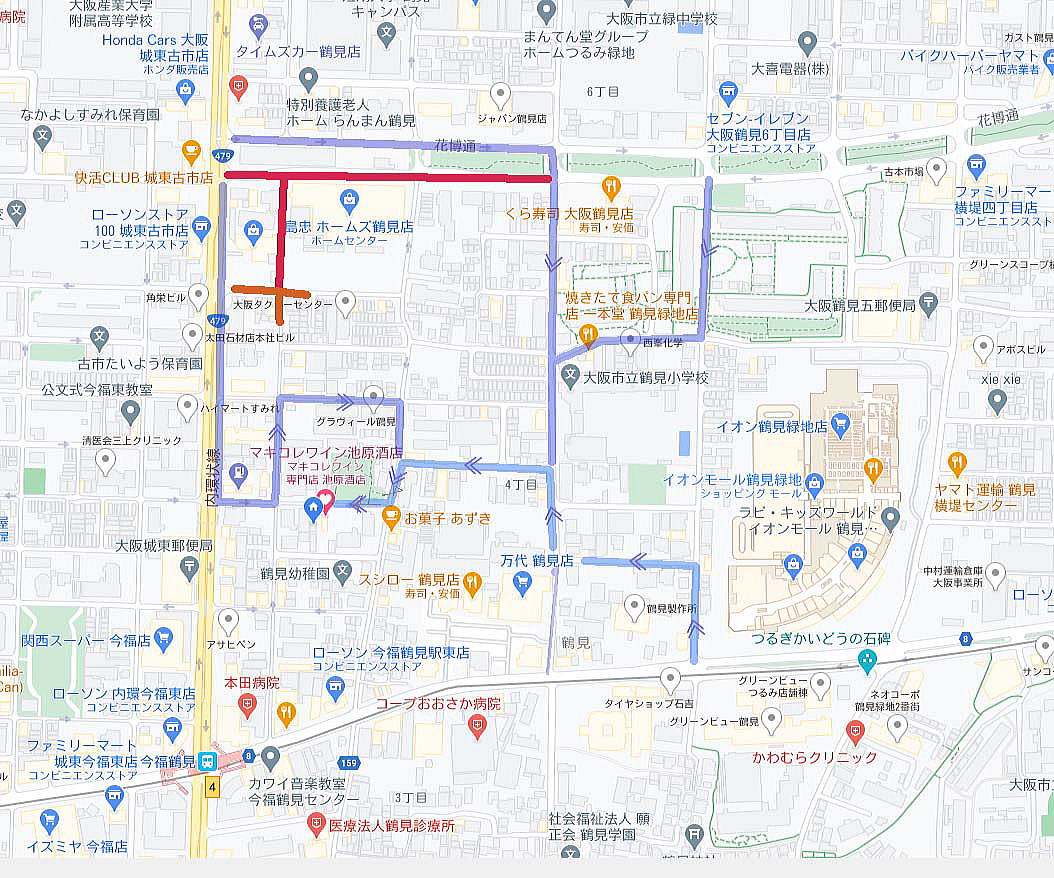 鶴見3を越えて、本田病院さんを左折でもいいのですが、人通りが多いので、鶴見4から